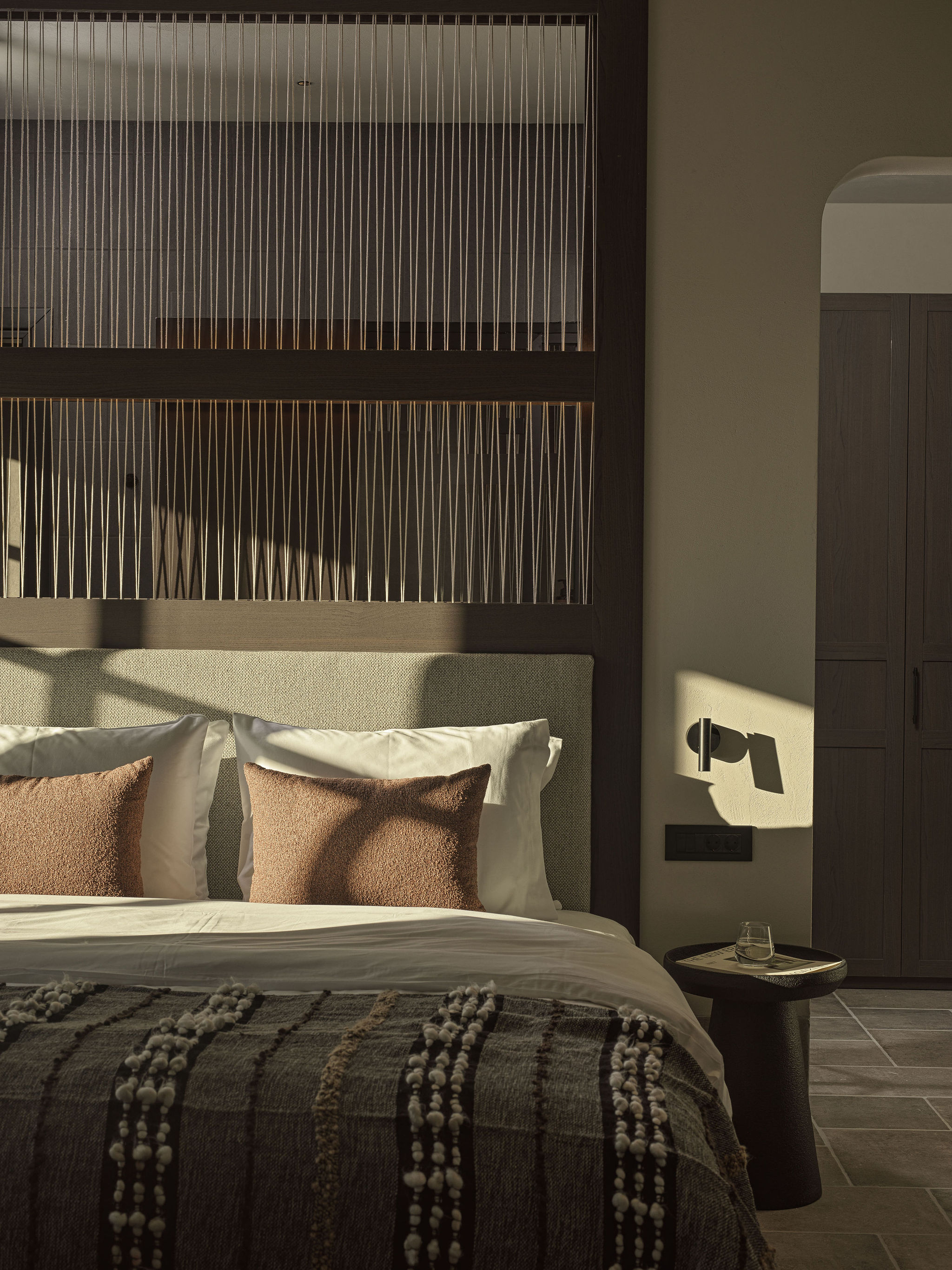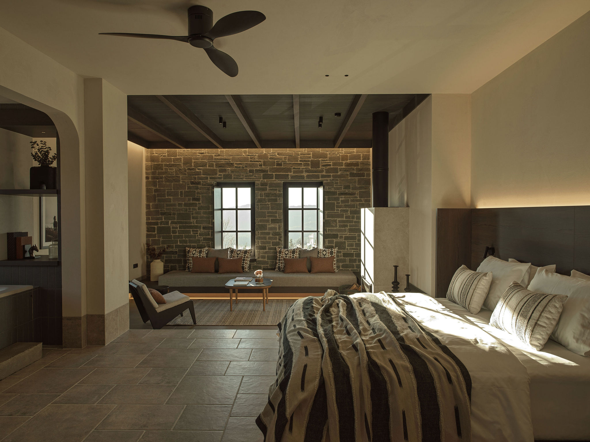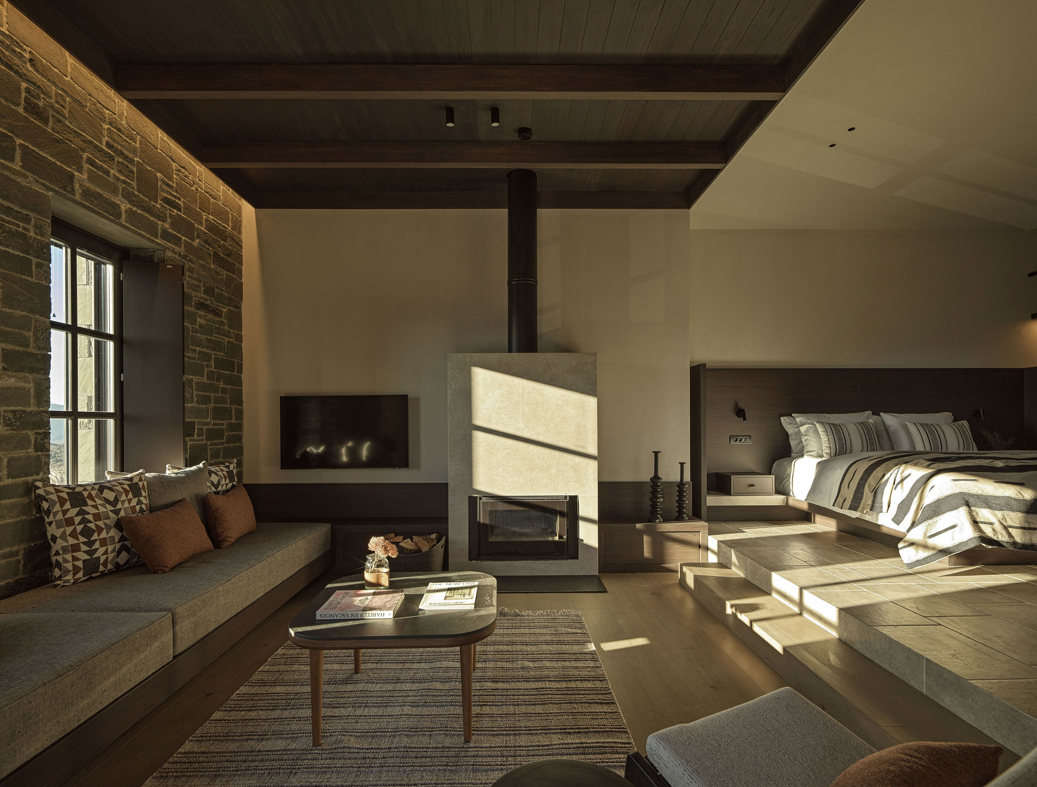 The seven suites on the upper floor are organized with clear geometries and subtle differentiation between the sleeping and living areas, without the need for rigid boundaries. The architectural composition emphasizes the continuity and honesty of materials: stone and earthy surfaces provide a solid foundation, while wood and woven textures introduce warmth, intimacy, and discreet luxury. Lighting, primarily indirect and carefully detailed, highlights the textures and geometric articulations of surfaces, enhancing the perception of the space and refined luxury.