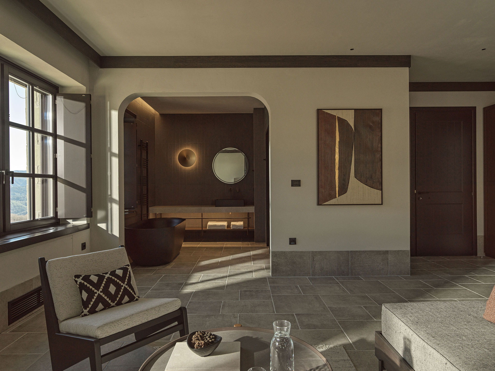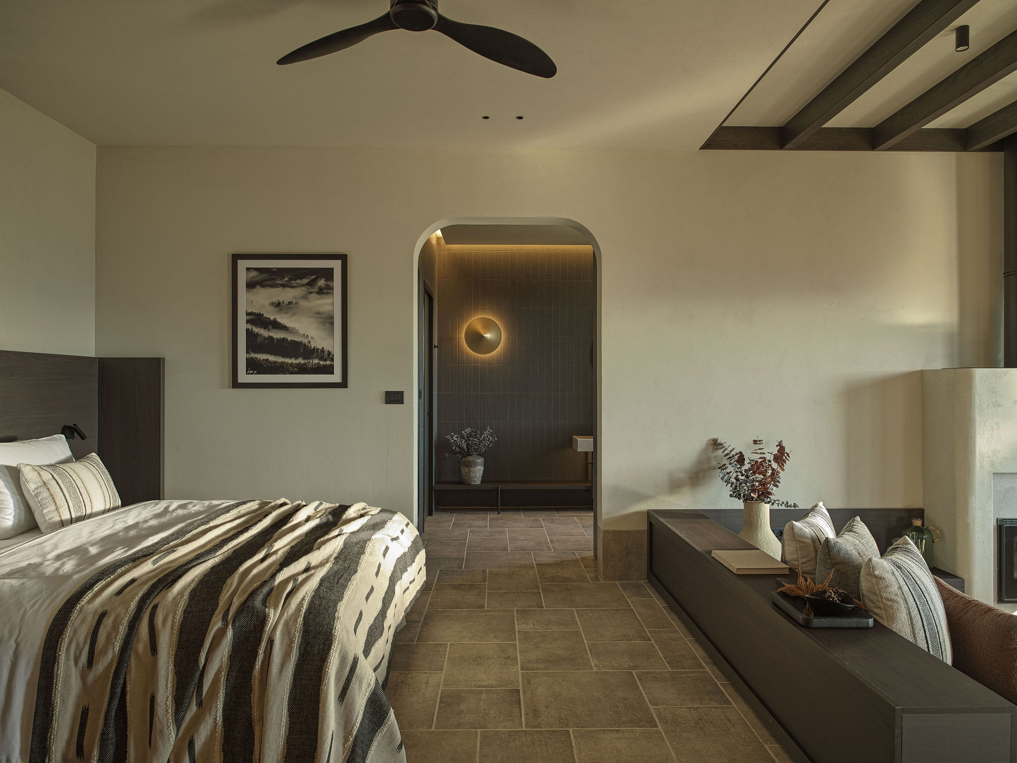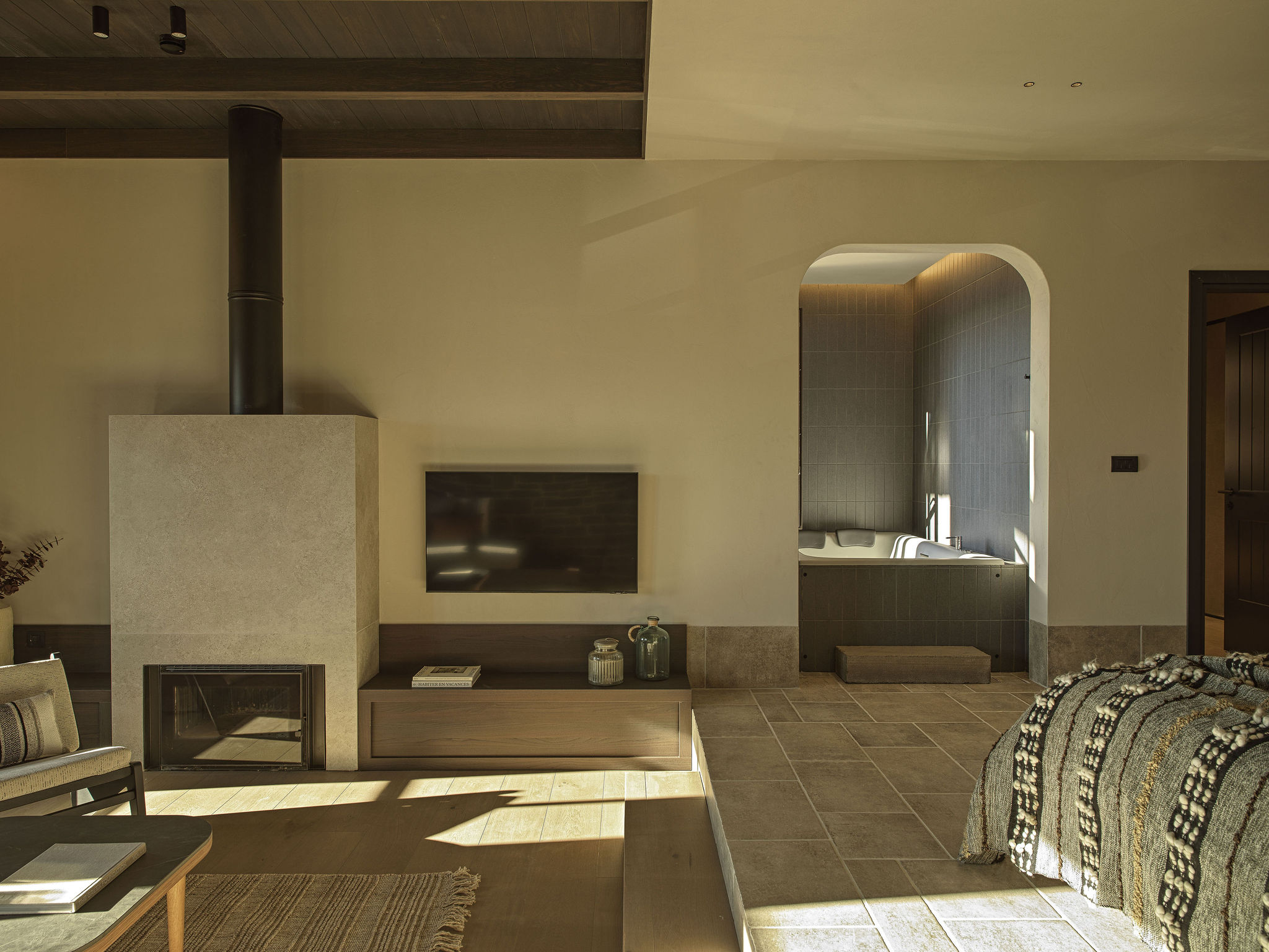 The seven suites on the upper floor are organized with clear geometries and subtle differentiation between the sleeping and living areas, without the need for rigid boundaries. The architectural composition emphasizes the continuity and honesty of materials: stone and earthy surfaces provide a solid foundation, while wood and woven textures introduce warmth, intimacy, and discreet luxury. Lighting, primarily indirect and carefully detailed, highlights the textures and geometric articulations of surfaces, enhancing the perception of the space and refined luxury.