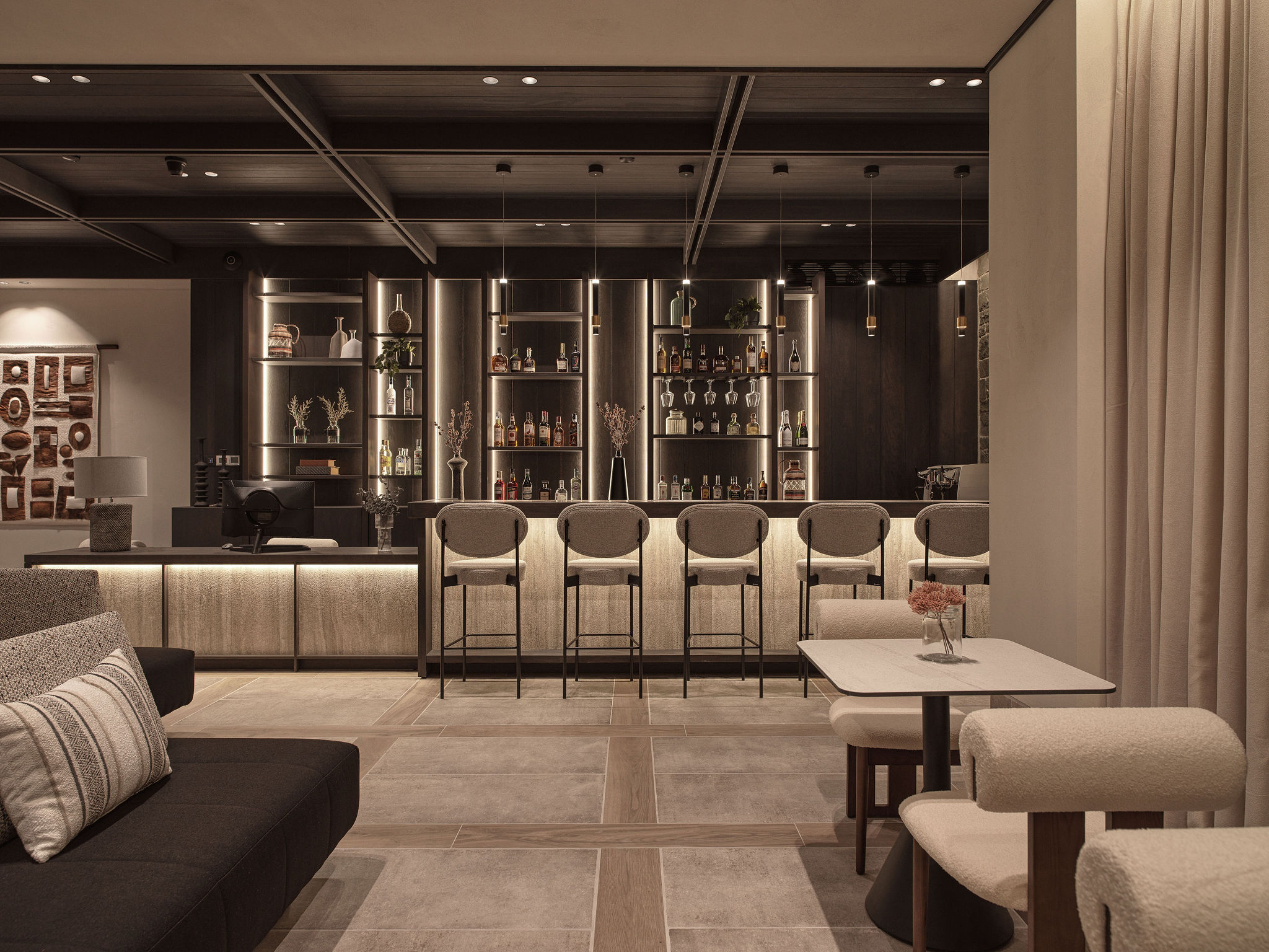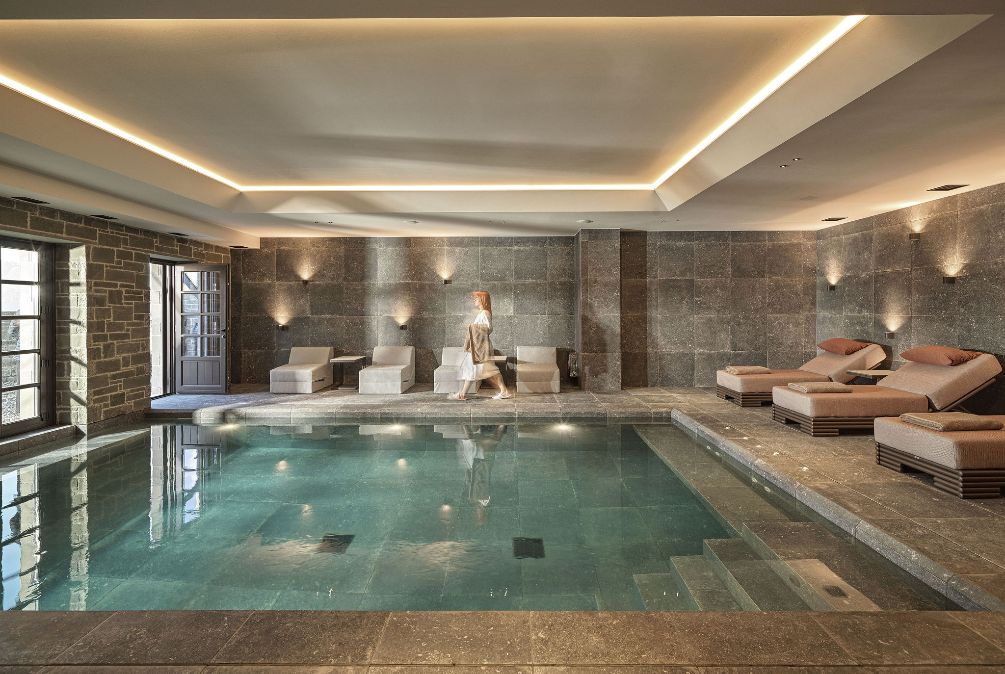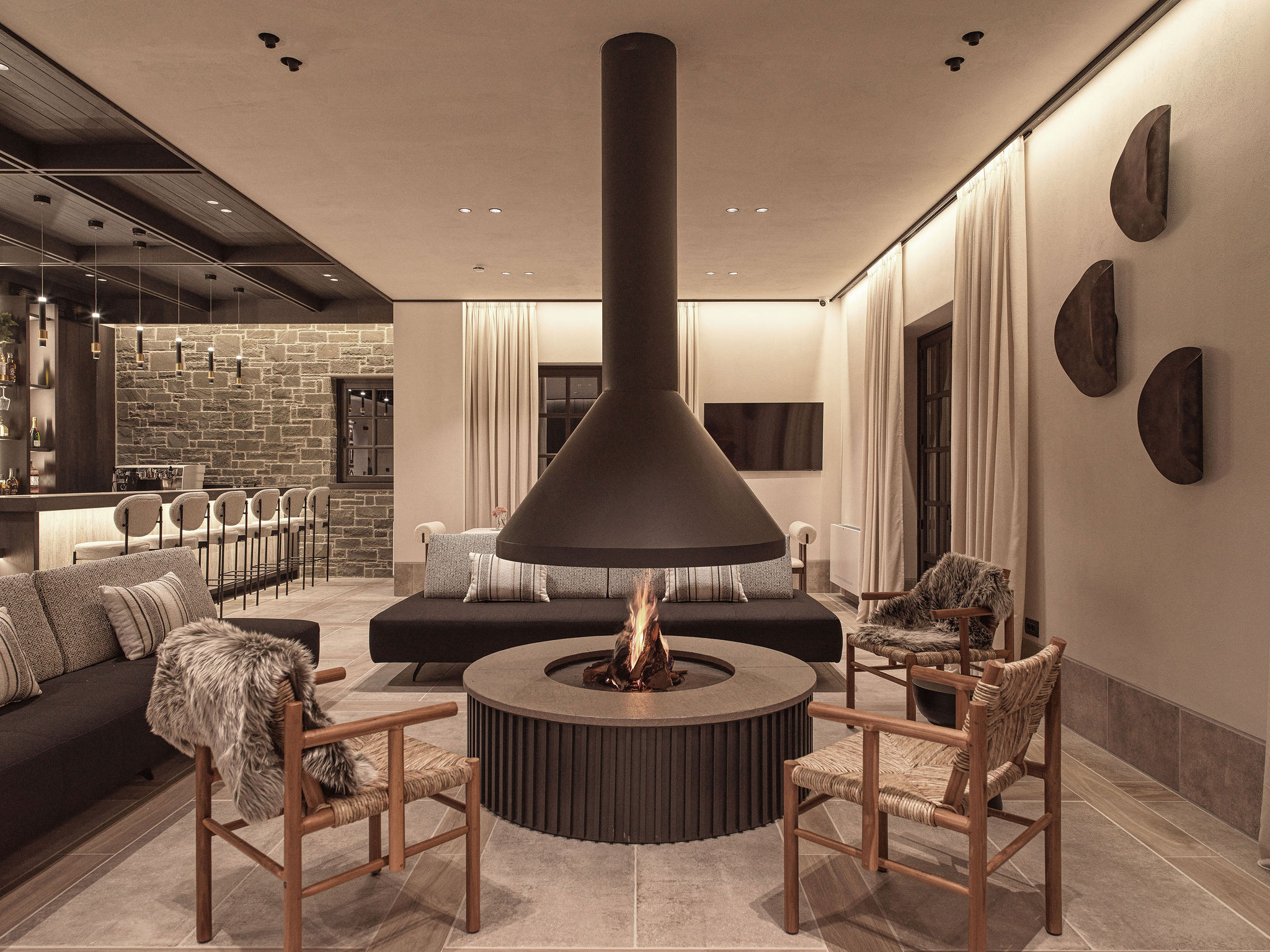 The reception area features a fireplace that acts as a social and spatial anchor, around which the seating area is organized, reinterpreting the notion of the “hearth.” The wellness area is conceived as a monolithic environment of material continuity, where controlled lighting and a restrained, earthy palette foster a calm, sensory atmosphere. natural stone, water, and clean, horizontal lines define a setting of internal serenity.