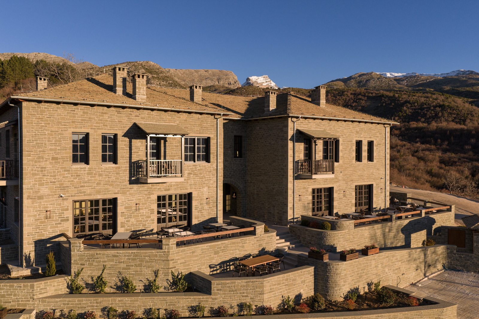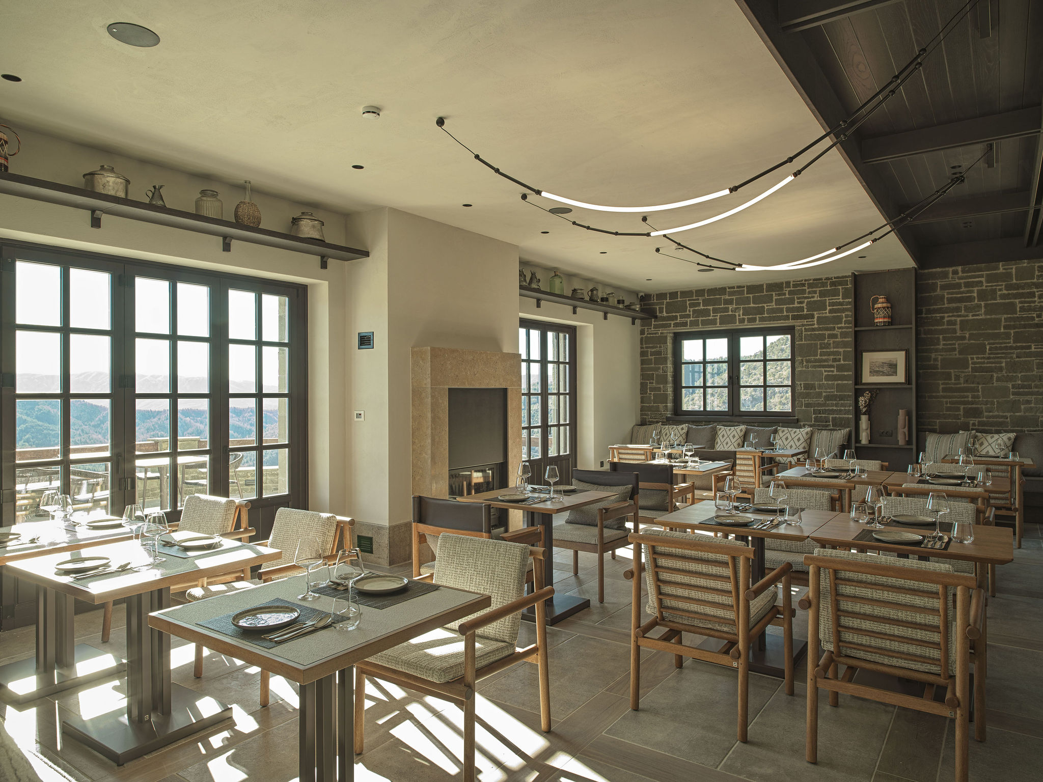 On the ground floor, shared hospitality spaces are arranged – lobby, reception, spa, and the restaurant Meratza. Named after the local tree, the restaurant functions as an autonomous gastronomic experience within the complex, reinforcing its connection to the local environment and cultural heritage. The spatial layout allows controlled sightlines toward the surrounding mountains while maintaining the sense of intimacy and retreat characteristic of traditional stone architecture.